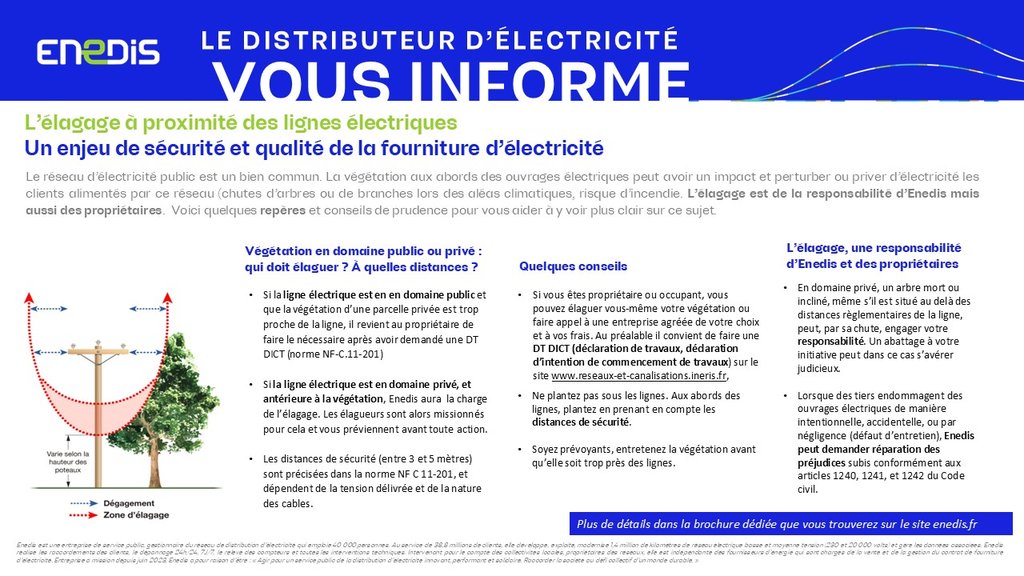 Enedis procède régulièrement à des opérations d’élagage afin de garantir d’une part, la sécurité des personnes et des biens contre les risques liés à la présence de végétation aux abords des réseaux électriques qu’elle exploite et, d’autre part, la qualité de la distribution de l’énergie électrique à ses clients.