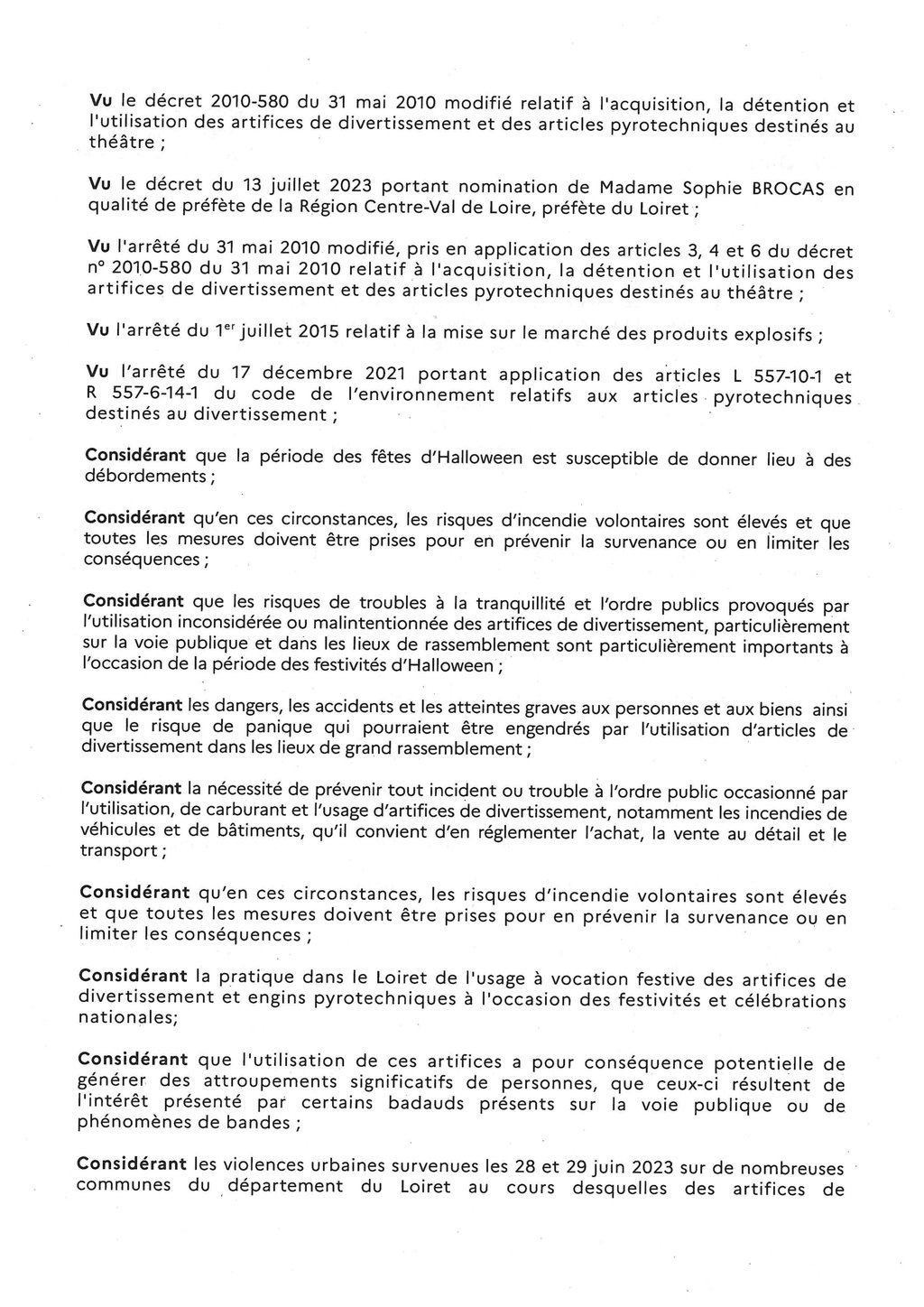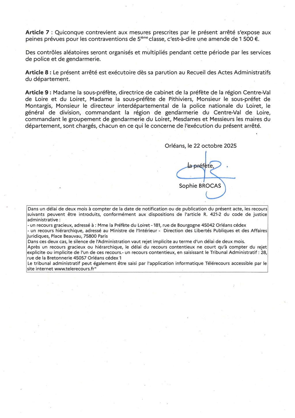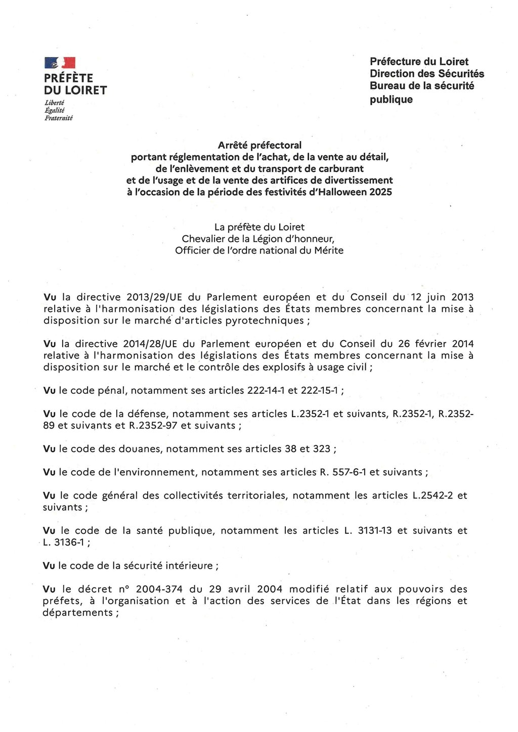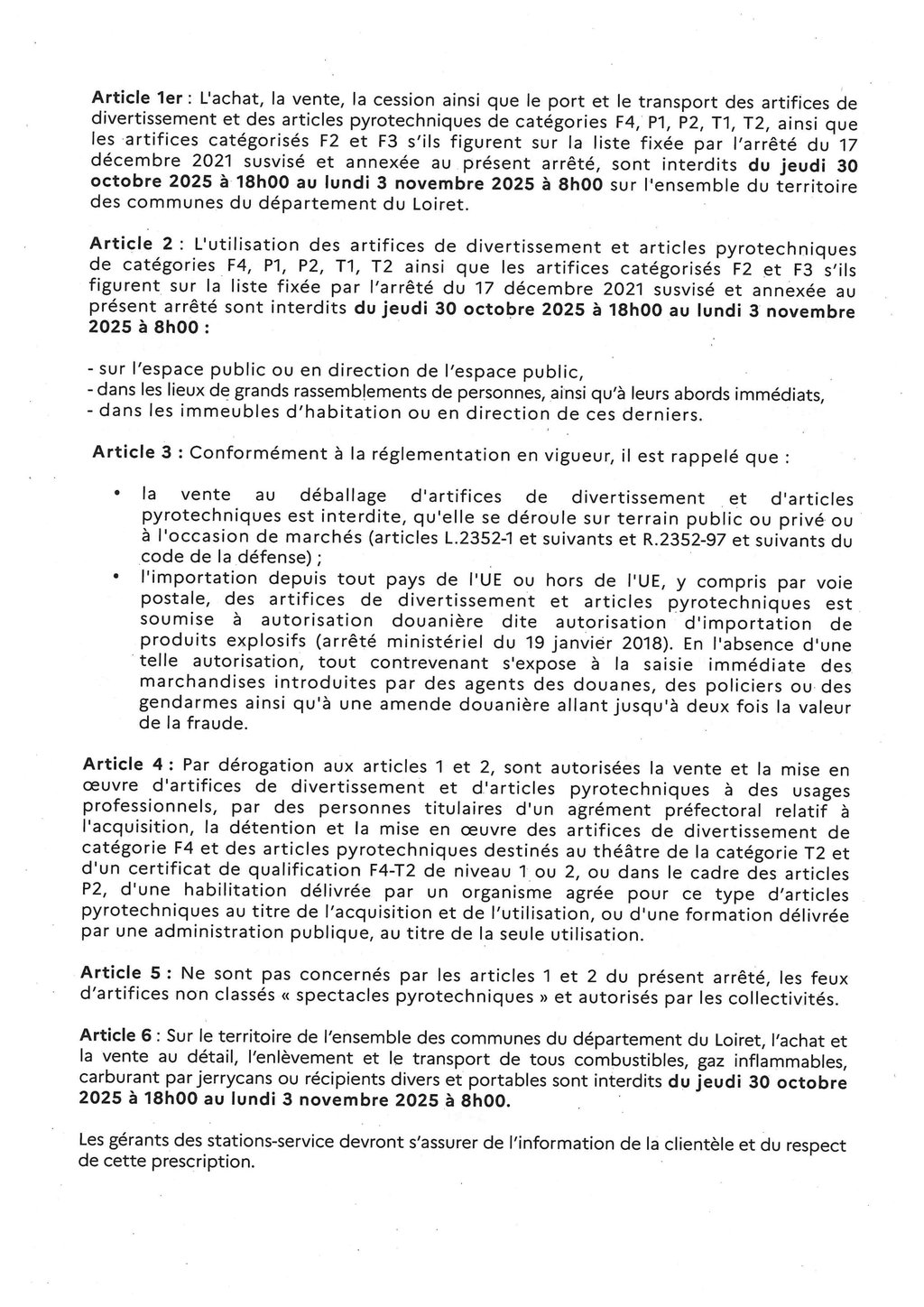 À cet effet, en prévision du prochain week-end d’Halloween, Mme la préfète de la Région centre-Val de Loire, Préfète du Loiret a décidé de prendre un arrêté préfectoral réglementant de manière temporaire (du 30 octobre 2025 au 3 novembre 2025), l’achat, la vente, le transport et l’utilisation d’artifices de divertissement, d’articles pyrotechniques, de produits explosifs et précurseurs d’explosifs, ainsi que la vente au détail et le transport en récipients de carburants ou tous produits inflammables ou corrosifs.