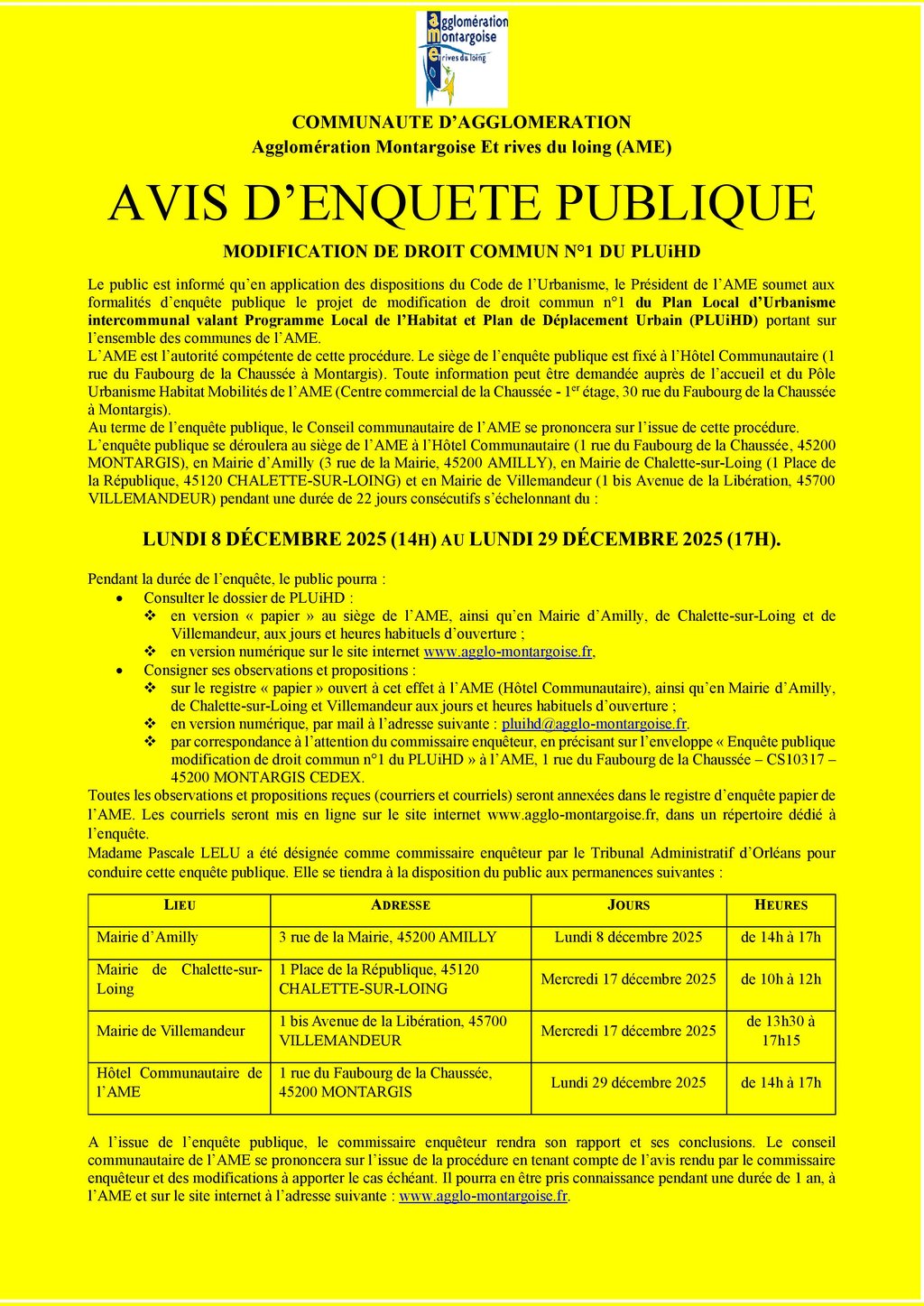 Les dossiers et registres d’enquête seront consultables en Mairie d’Amilly, de Chalette-sur-Loing, de Villemandeur et à l’Hôtel Communautaire de l’AME aux jours et heures habituels d’ouverture :