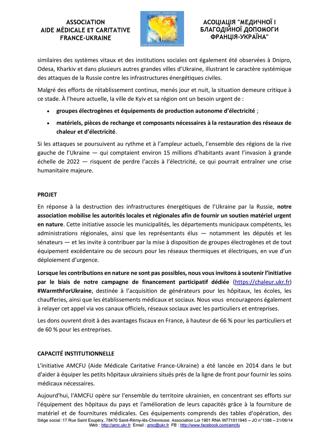 ’Association Aide Médicale Caritative France-Ukraine (AMCFU) dans le cadre de son initiative « Chaleur pour l’Ukraine ».