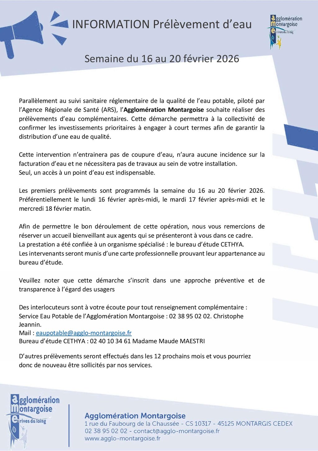 C’est le bureau d’étude CETHYA qui sera missionné pour la réalisation des prélèvements chez les abonnés.