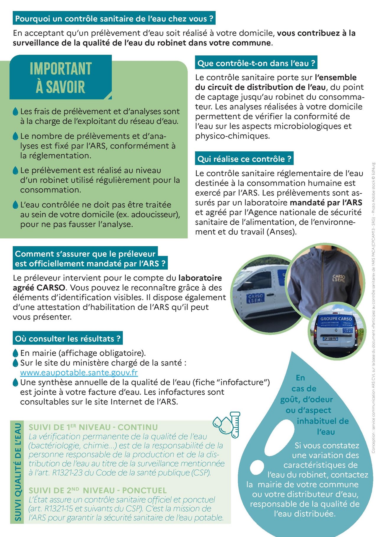 Dans le cadre du contrôle sanitaire de l’eau destinée à la consommation humaine, l’Agence régionale de santé (ARS) Centre-Val de Loire peut être amenée à réaliser des prélèvements d’eau au robinet chez des particuliers, afin de vérifier la qualité de l’eau distribuée.