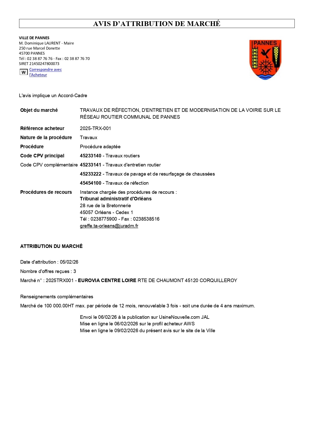 AVIS D'ATTRIBUTION